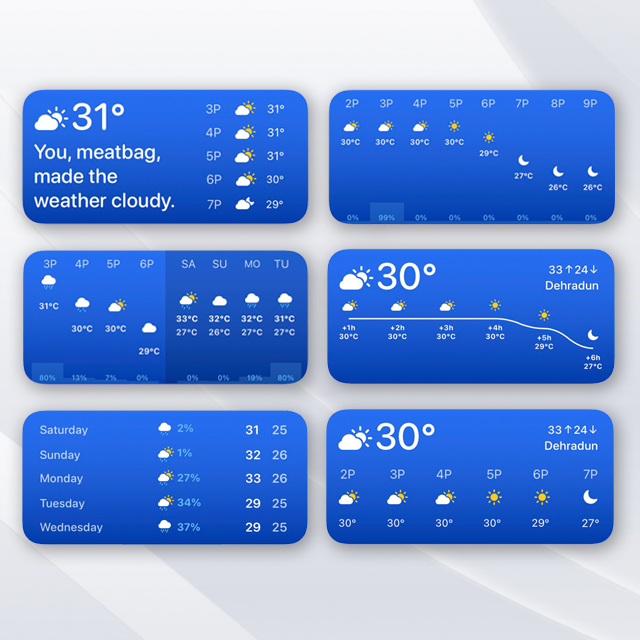 Here's your chance to get the beautiful & amazing 11 weather widgets supporting both light & dark mode. And if you're a fan of humour then there's 2 widget (1 small & 1 medium) specifically for you which show weather status with humour.